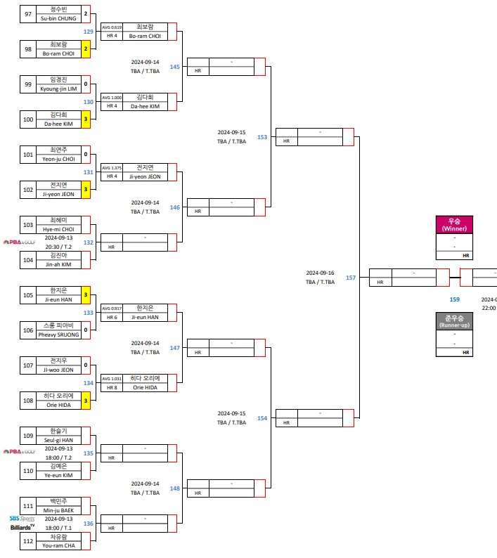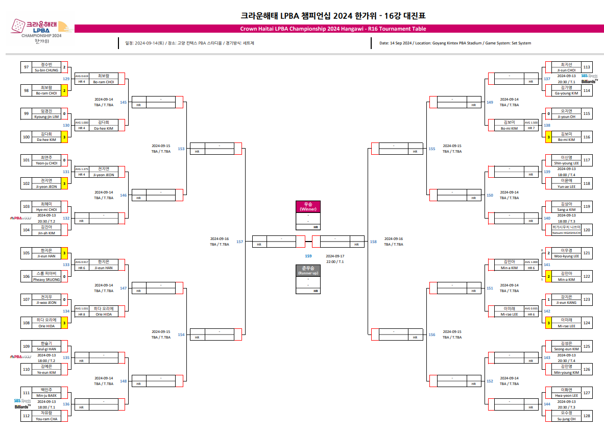 | 크라운해태 LPBA 챔피언십 2024 한가위 16강 대진표 확정 (1) | 2024.09.14 |
