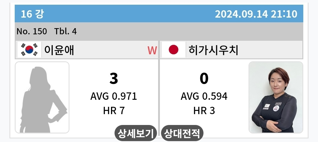 이신영을 꺽고 16강에 진출한 이윤애 당구선수는 LPBA 챔피언출신의 히가시우치 나츠미(나쓰미) 선수 마저 애버리지 0.971을 기록하면서 3대 0으로 이기고 8강에 진출하였습니다. 8강에서 김가영 선수에게 3대 0으로 졌지만 엄청난 돌풍을 일으키며 자신의 이름을 각인시켰습니다.