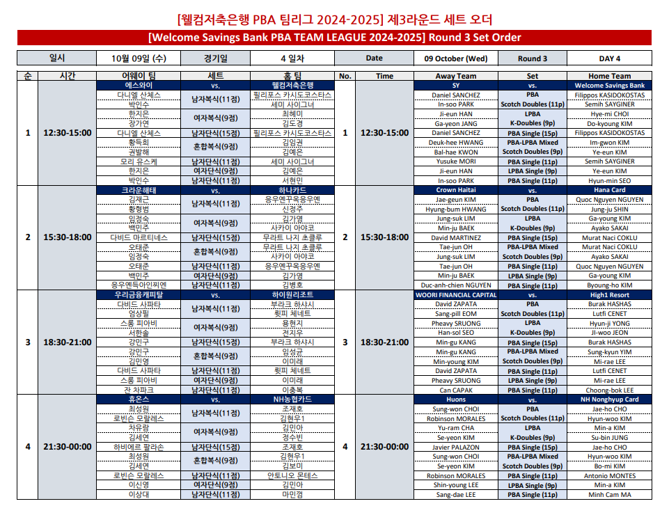 오늘 진행되는 3라운드 4일차 경기 포맷 및 세트 오더입니다. 우선 12시 30분 첫 경기는 산체스가 소속된 에스와이 당구팀과와 사이그너와 카시도코스타스가 소속된 웰컴저축은행 당구팀입니다.