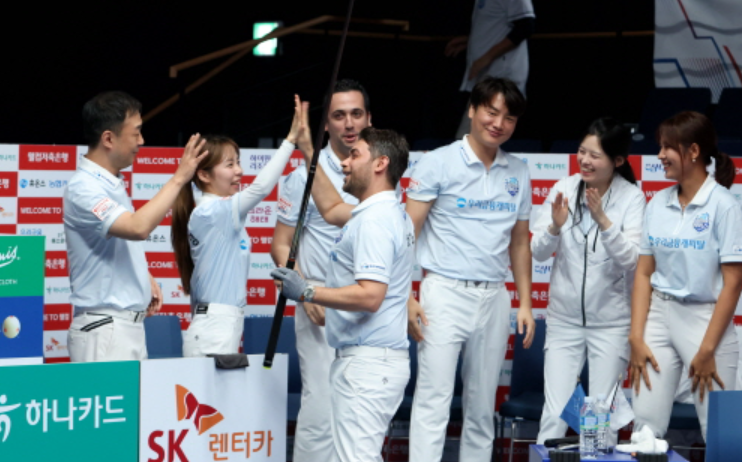 우리금융캐피탈 당구팀은 하이원리조트 당구팀의 경기는 풀세트 접전 끝에 승리했습니다. 조재호 주장이 이끄는 NH농협카드 당구팀은 최성원 선수가 주장으로 있는 휴온스 당구팀을 꺾고 2연승을 달렸습니다. 서현민 선수가 캡틴으로 활약하는 웰컴저축은행 당구팀은 에스와이 바자르 당구팀을, 김재근 선수가 이끄는 크라운해태 당구팀은 하나카드 당구팀을 각각 제압했습니다.