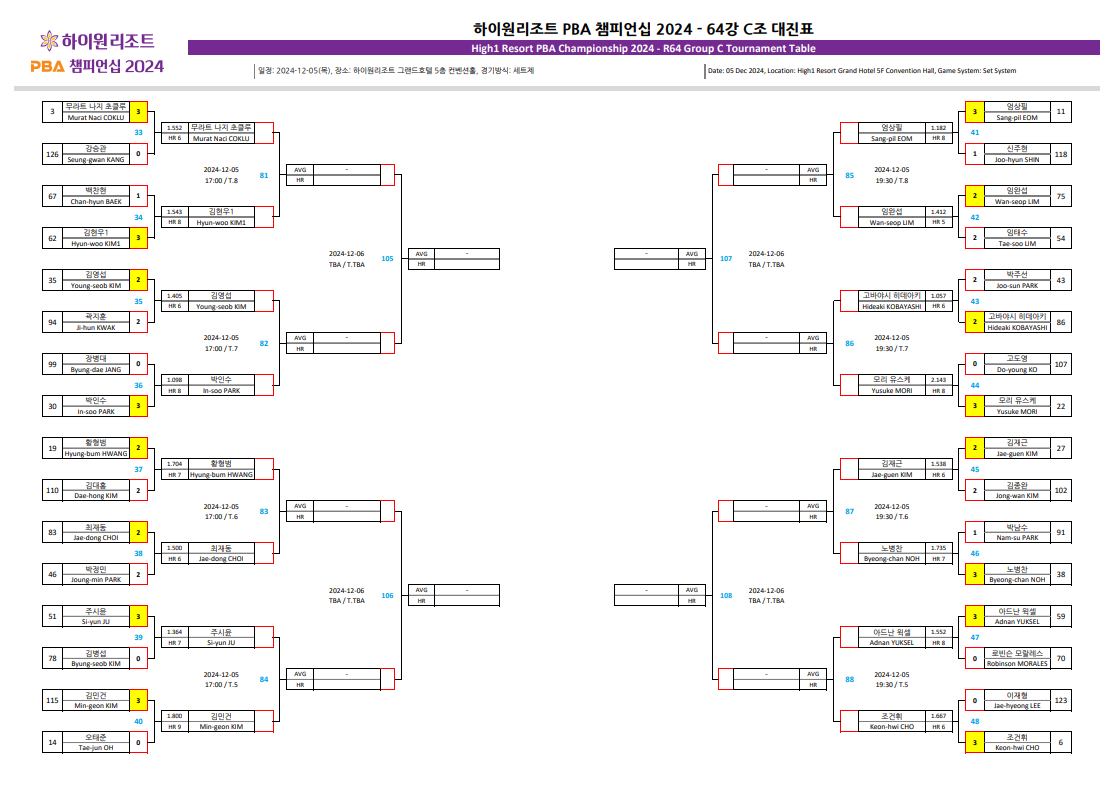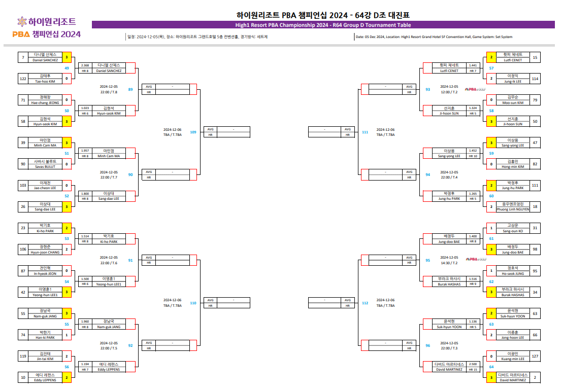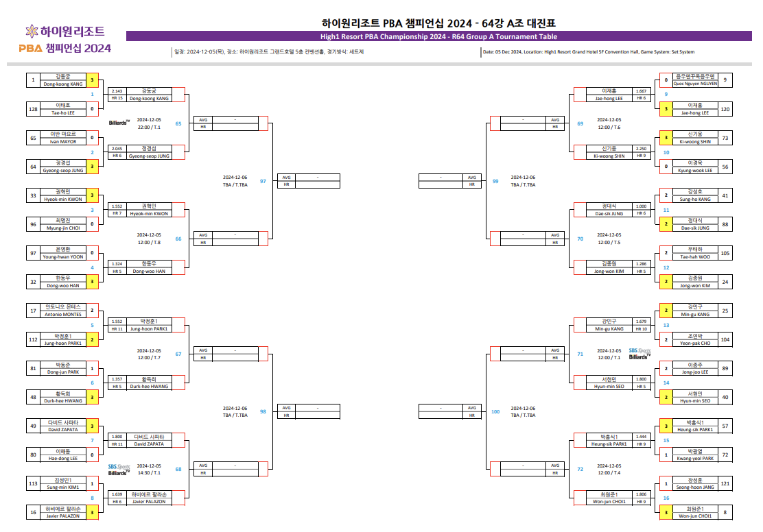 | 하이원리조트 PBA 챔피언십 32강 대진표 - 64강 경기결과 (프로당구 2024-25시즌) (4) | 2024.12.06 |