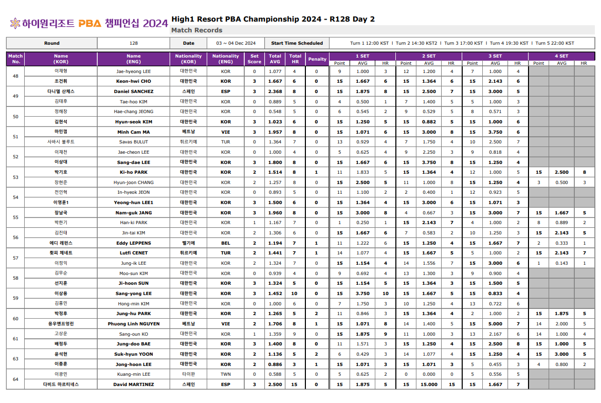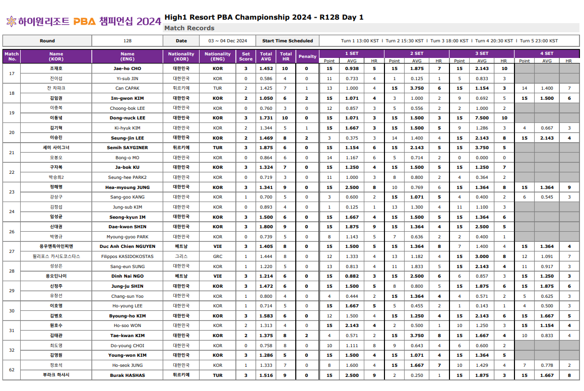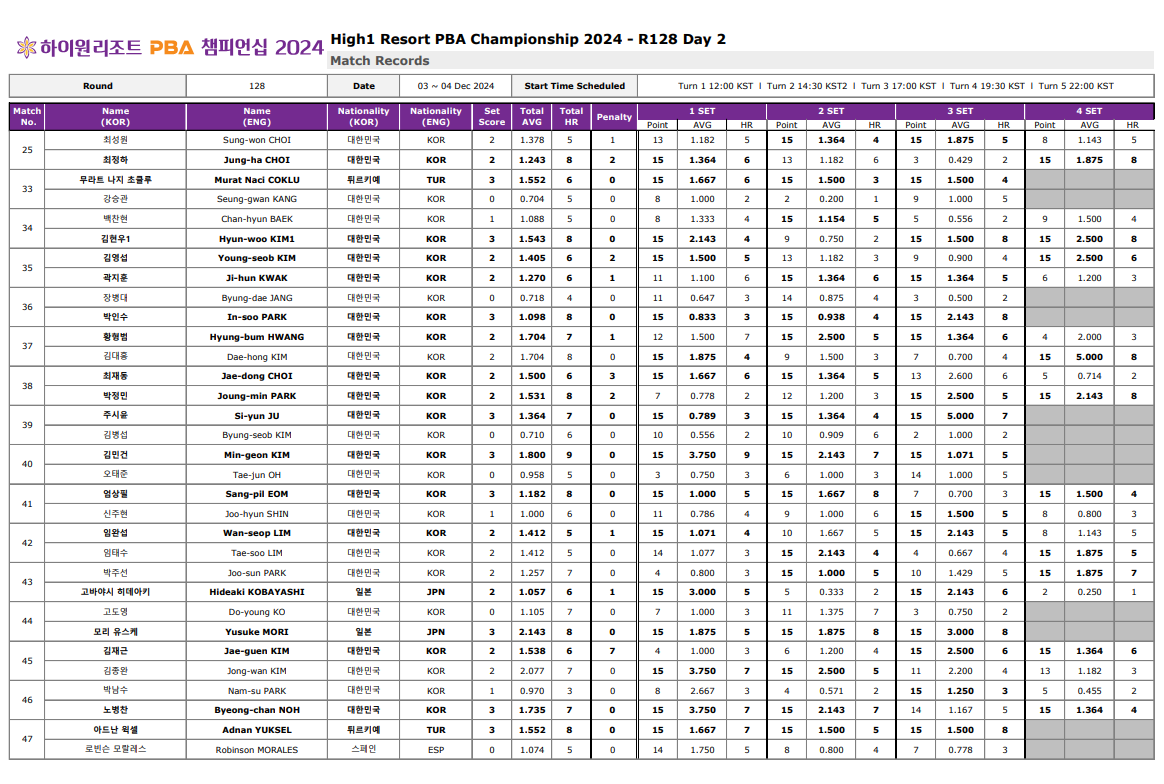 1. 하이원리조트 PBA 챔피언십128강 경기결과