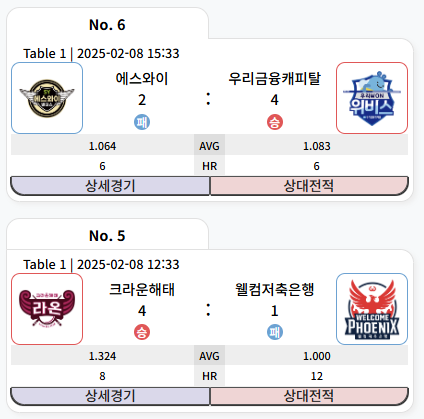 우리금융캐피탈과 크라운해태로 5라운드 2일차 경기결과입니다. SK렌터카, 휴온스, 크라운해태, 우리금융 캐피탈이 상대팀을 확실하게 이기고 4개팀 모두 승점 3점을 추가하였습니다.