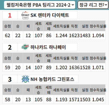 올 시즌 정규 리그 전체에서 전체 경기 결과, 1위팀은 SK렌터카 다이렉트가 22승 12패, 승점 62점으로 1위에 올라있습니다. 2위는 하나카드 하나페이로 20승 14패, 승점 59점을 기록하고 있습니다. 3위팀은 NH 농협카드 그린포스로 20승 13패,승점 58점을 기록하고 있습니다.4위팀은 우리금융캐피탈 당구팀으로 18승 16패, 승점 57점을 기록하고 있습니다.그리고 5위는 웰컴저축은행으로 15승 19패로 승점 48점을 기록하고 있습니다.