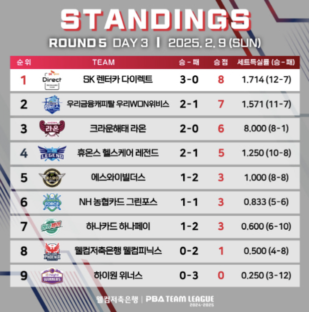 PBA 팀리그 경기결과 - SK렌터카 1위 질주 (24-25시즌 5라운드 3일차 순위)