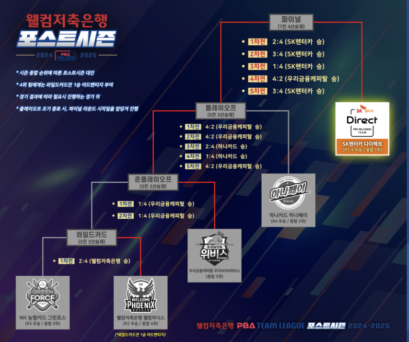 한편 포스트 시즌에 올라온 다른 세 팀의 경기를 살펴보면, 우선 NH농협카드 그린 포스는 와일드카드로 진출하였으나 웰컴 저축은행 웰컴 피닉스와의 경기에서 패하면서 플레이오프 진출이 좌절되었습니다. 웰컴저축은행 당구팀은 와일드카드로 올라온 NH 농협카드 그린 포스팀을 이기고 플레이오프에 진출하였으나 우리금융캐피탈에게 패하였습니다.