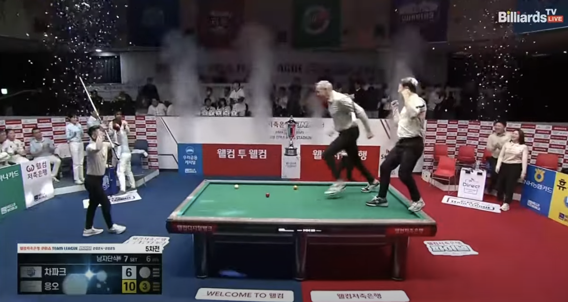 PBA 팀리그 Final 5경기 7세트에서 우리금융캐피탈의 찬 차파크를 상대로 SK렌터카 당구팀의 응오딘나이가 포스트시즌 우승을 결정짓는 매치포인트를 옆돌리기로 성공시키는 장면입니다.