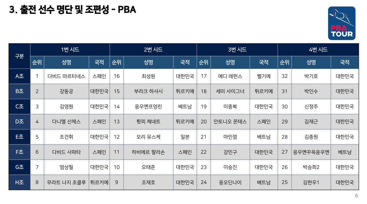 - 예선: PBA는 32강은 8개조로 예선 리그전 진행, 조별 상위 2위까지 16강 진출 (5전 3선승제)합니다. LPBA는 32강은 8개조로 예선 리그전 진행, 조별 상위 2위까지 16강 진출 (3전 2선승제)이 결정됩니다.