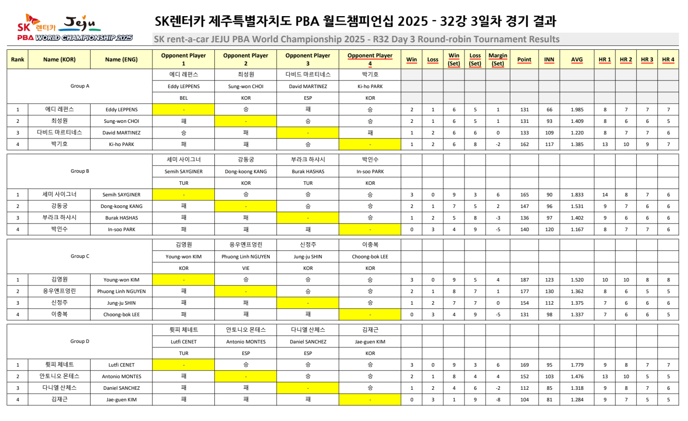 🏆 SK렌터카 제주특별자치도 PBA 월드챔피언십 2025 - 32강 3일차 경기 결과 및 종합 순위