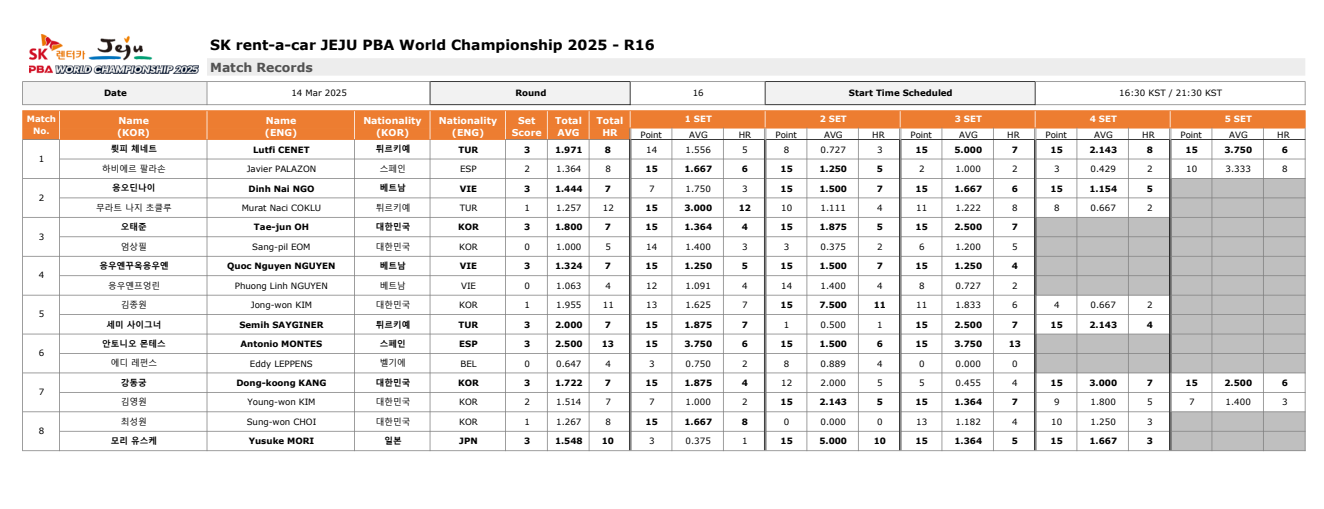제주특별자치도 한라체육관에서 열린 SK렌터카 제주특별자치도 PBA 월드챔피언십 2025의 16강 경기 결과. 륏피 체네트, 응오딘나이, 오태준, 응우옌꾸옥 응우옌, 세니 사이그너, 안토니오 몬테스, 강동궁, 모리 유스케 선수가 8강 대진표에 이름을 올렸습니다.