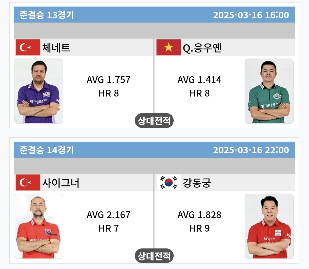 튀르키예 선수가 2명(세미 사이그너, 륏피 체네트)이나 준결승에 진출한 것이 인상적입니다. 베트남의 응우옌 꾸옥 응우옌과 한국의 강동궁은 적어도 튀르키예 선수들까지 펼치는 결승전을 막아 내기를 기대합니다.