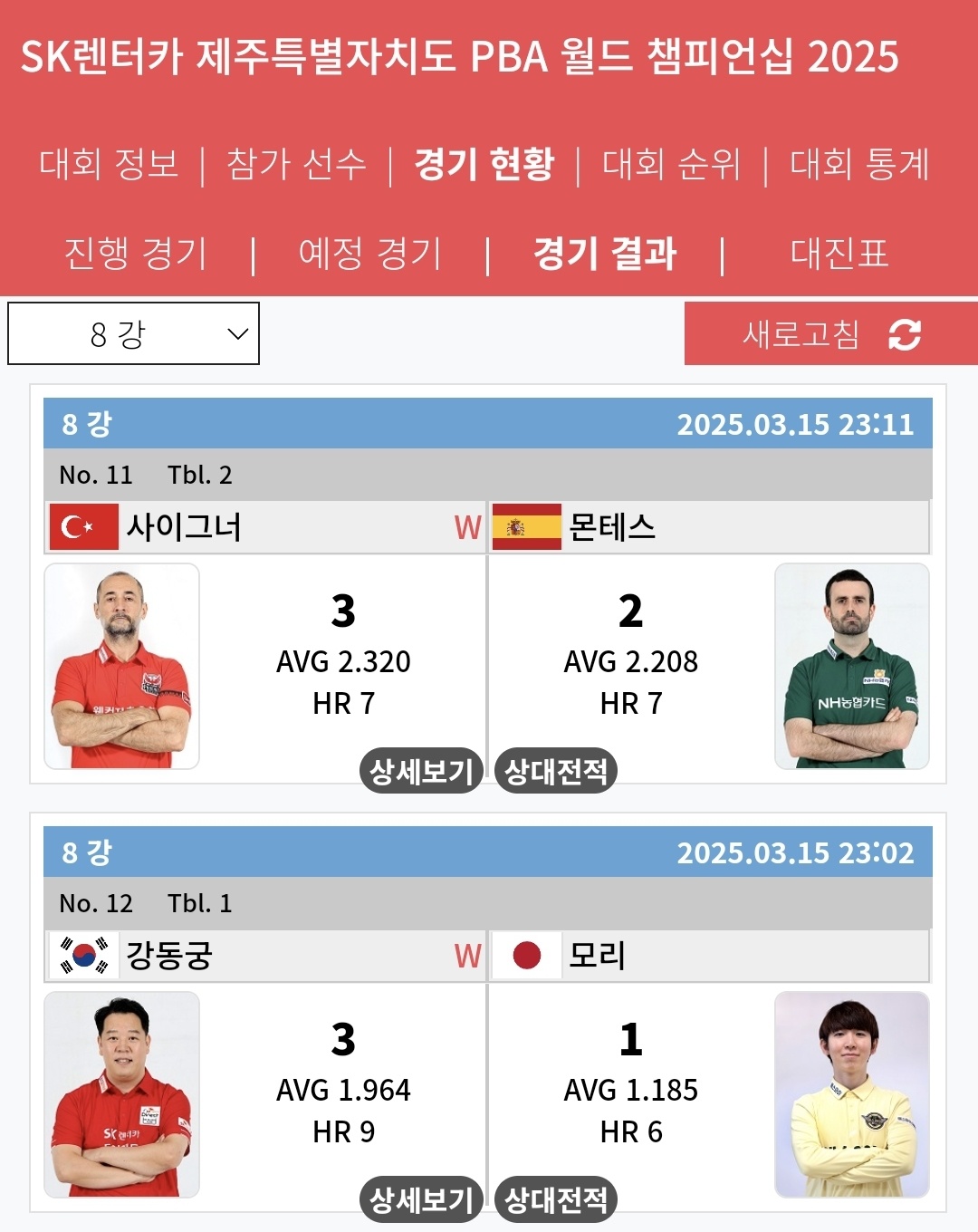 | SK렌터카 PBA 월드챔피언십 2025 - 8강 대진표 16강 경기결과 (0) | 2025.03.15 |