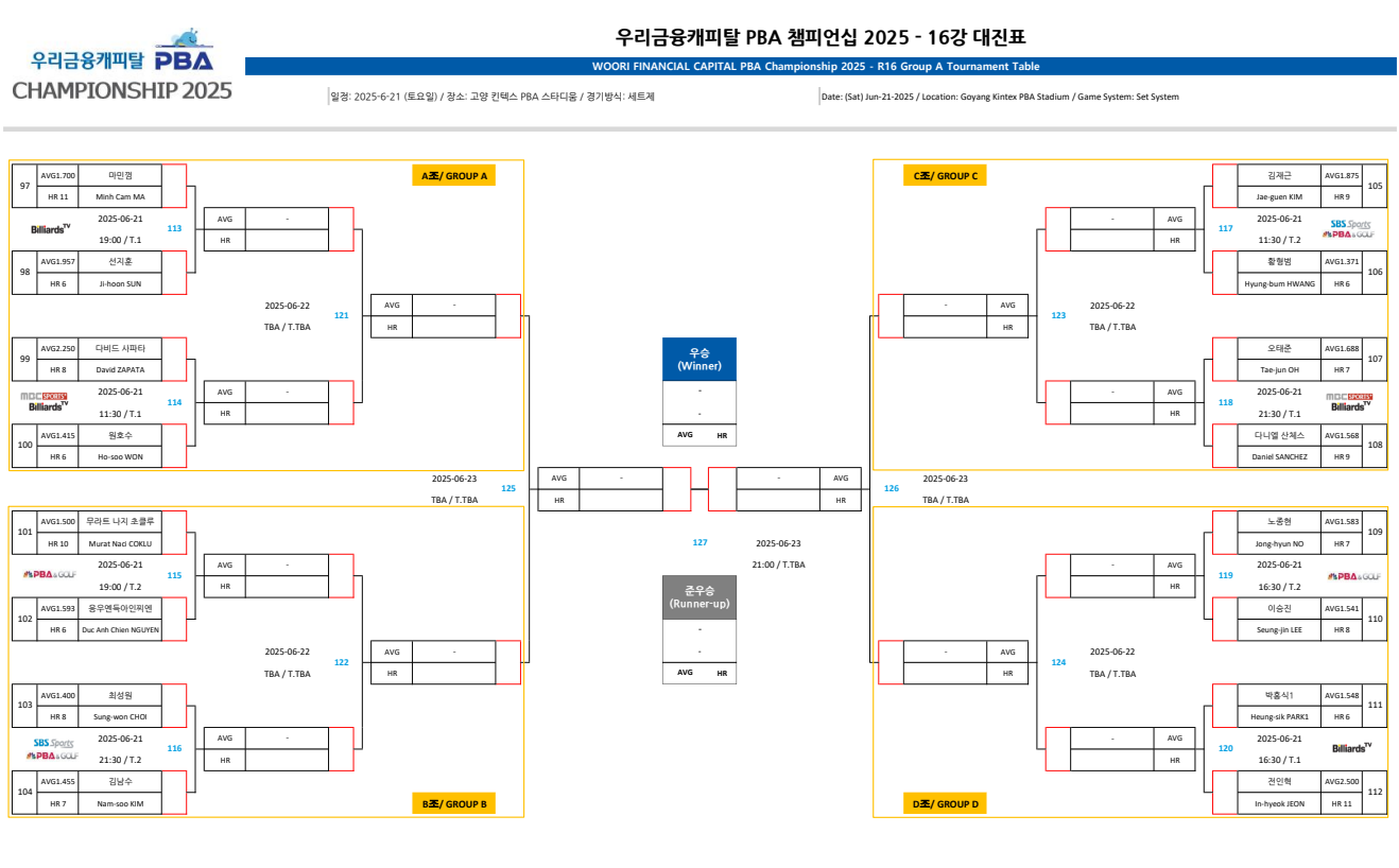 어제끝난 우리금융캐피탈 PBA 챔피언십 32강 경기 결과에따른 최종 16강 대진표는 다음과 같습니다.