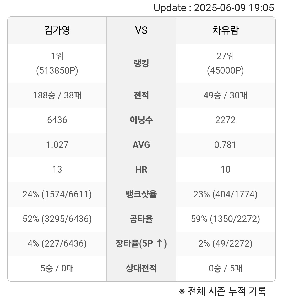 ■ 김가영 vs 차유람 상대전적은, 누가 우승할까요?