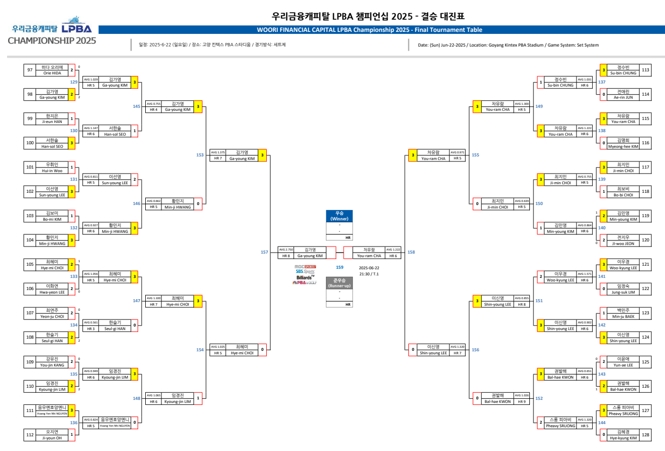 ■ 우리금융캐피탈 LPBA 챔피언십 결승 경기결과 우승 김가영 준우승 차유람