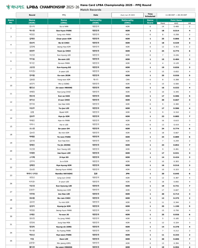 지금부터는 PQ 라운드 대진표를 살펴보겠습니다. 하나카드 LPBA PPQ라운드 대진표를 조별로 살펴보겠습니다. LPBA PQ 대진표는 워낙 매치 수가 경기 수가 많기 때문에 모두 살펴볼 수 있고 각 조별로 눈에 띄는 대진을 살펴보도록 하겠습니다.