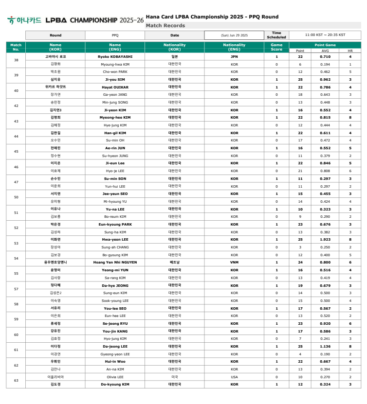 아무튼 하나카드 LPBA 챔피언십 PPQ라운드에서 승리한 선수들은 예선 2차전에 해당하는 PQ라운드가 펼쳐집니다. PQ라운드를 통과하면 64강 대진표에서 기다리고 있는 LPBA 32강의 선수들과 32강 진출을 위한 한 판 승부를 펼칩니다.
