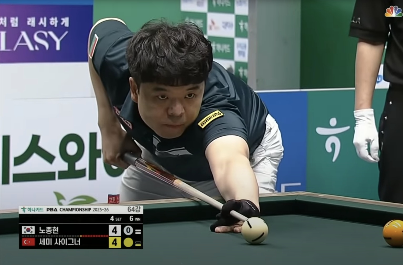 노종현 선수는 64강 경기에서 세트스코어 2대 1로 앞선 4세트에서 사이그너와 14:14까지 치열한 승부를 이어갔지만, 마지막 매치 포인트를 일반적인 비켜치기가 아닌 세워치식 더블쿠션으로 풀어내면서 사이기너를 울렸습니다.