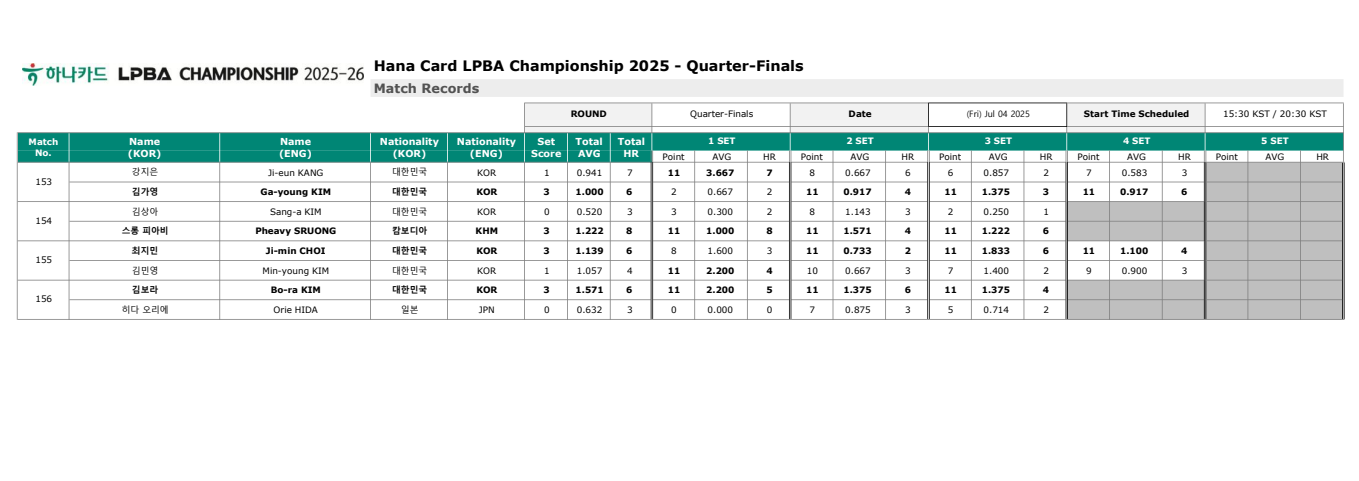 하나카드 LPBA 챔피언십 8강 경기 결과입니다. 김가영, 스롱 피아비, 최지민, 김보라 선수가 4강 준결승에 진출하였습니다.