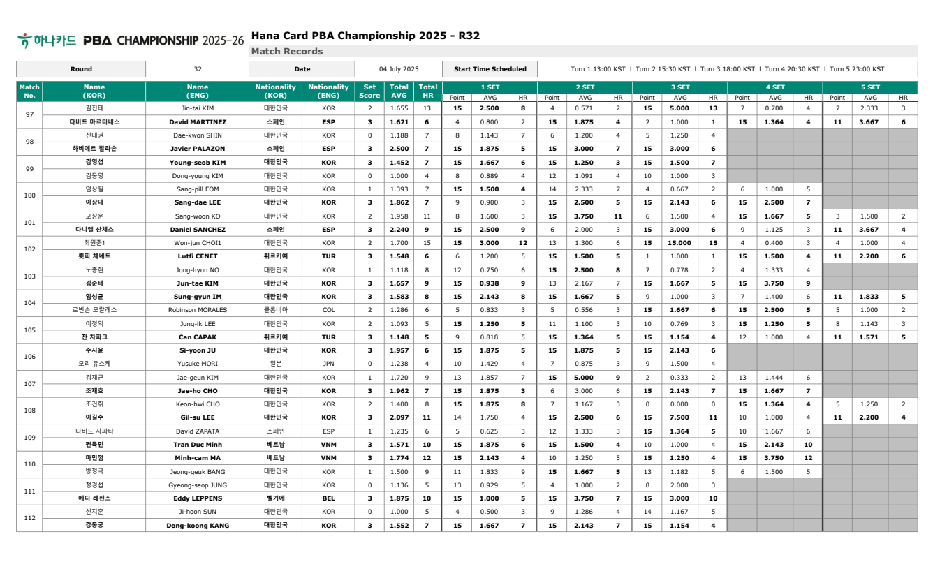 하나카드 PBA 챔피언십 32강 경기 결과 (2025-26시즌)