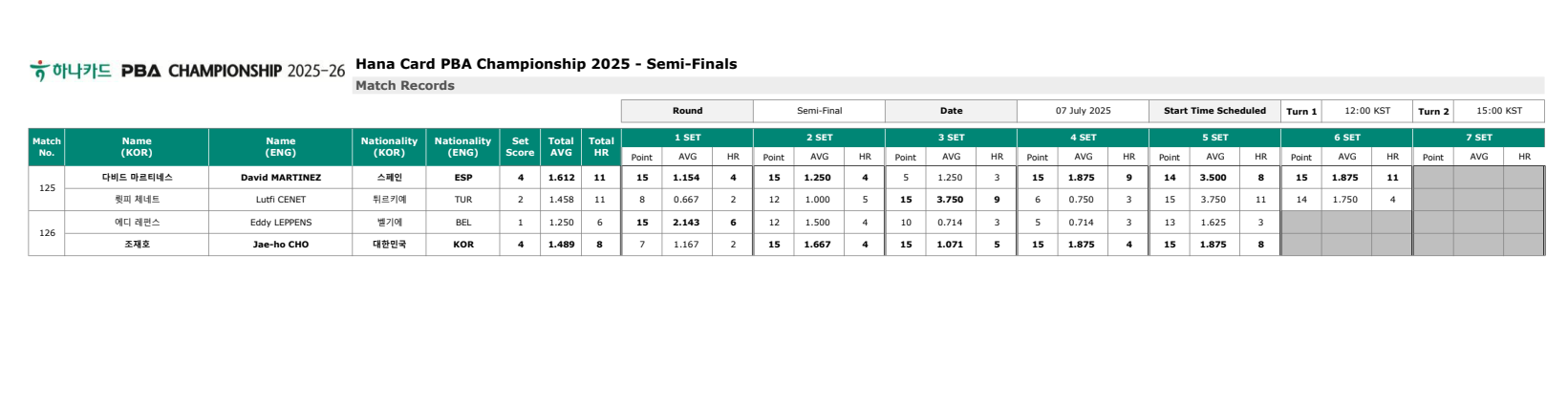 먼저 프로당구 2025-26시즌 2차대회 하나카드 PBA 챔피언십 4강 경기결과 입니다. 첫번째 4강 경기, 다비드 마르티네스와 륏피 체네트 (루피 체넷)의 경기 결과는 마르티네스그 3대1 2로 체네트를 이기고 결승에 올랐습니다.