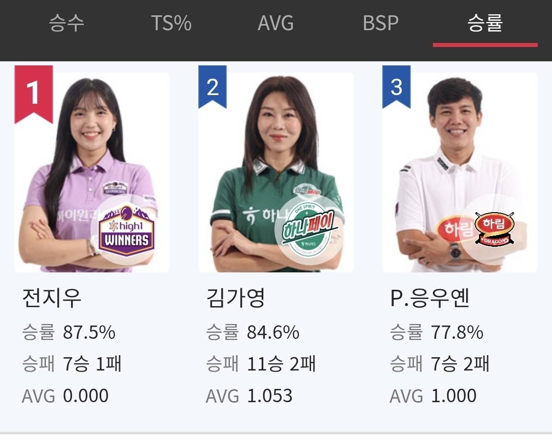 한편 1라운드 8일차까지 승률 1위를 기록하고 있는 당구선수는 올시즌에 PBA팀리그에 들어온 LPBA 신예 전지우 입니다. 전지우 당구선수는 7승 1패로 승률 87.5%를 기록하고 있습니다. 이충복과 출전한 남녀혼복조에서 승리를 쓸어담고 있습니다. 승수 1위인 김가영 선수보다 승률이 높습니다.