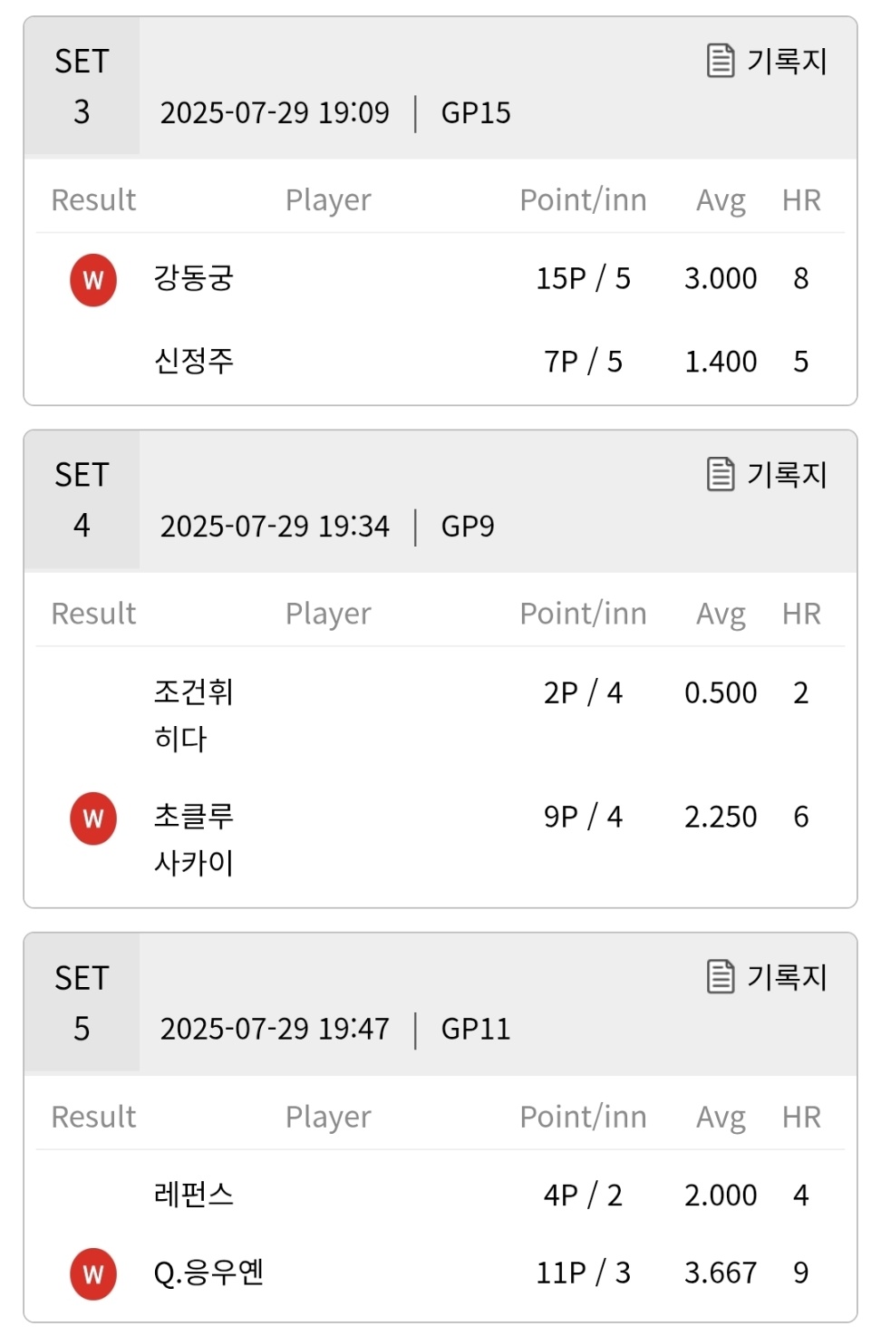 어제까지 1위를 지켰던 SK렌터카 당구팀은 최근 2연패를 하면서 3위로 밀려났습니다. 하지만 아직 2위 ~ 4위까지는 5승 3패로 승패는 모두 동일합니다. 오늘 마지막 경기에서 1라운드 승패가 결정날 것 같습니다.