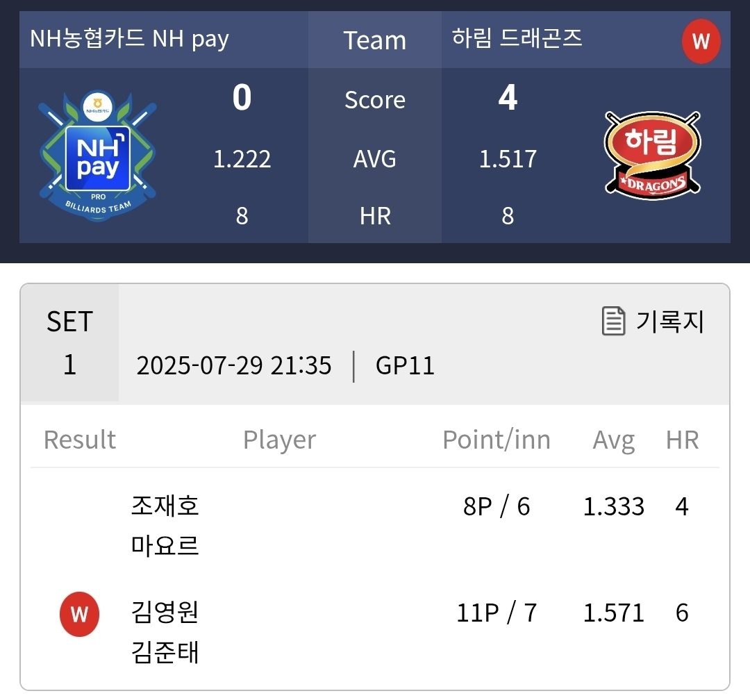 NH농협카드 VS 하림 당구팀의 경기에서는 하림 당구팀이 4대 으로 압승을 거두었습니다. 1세트 남자 복식에서는 김영원 김준태는 조재호 마요를 조를 11:8로 이겼습니다. 스페인의 신예 이반 마요르는 아직 실력이 부족합니다.
