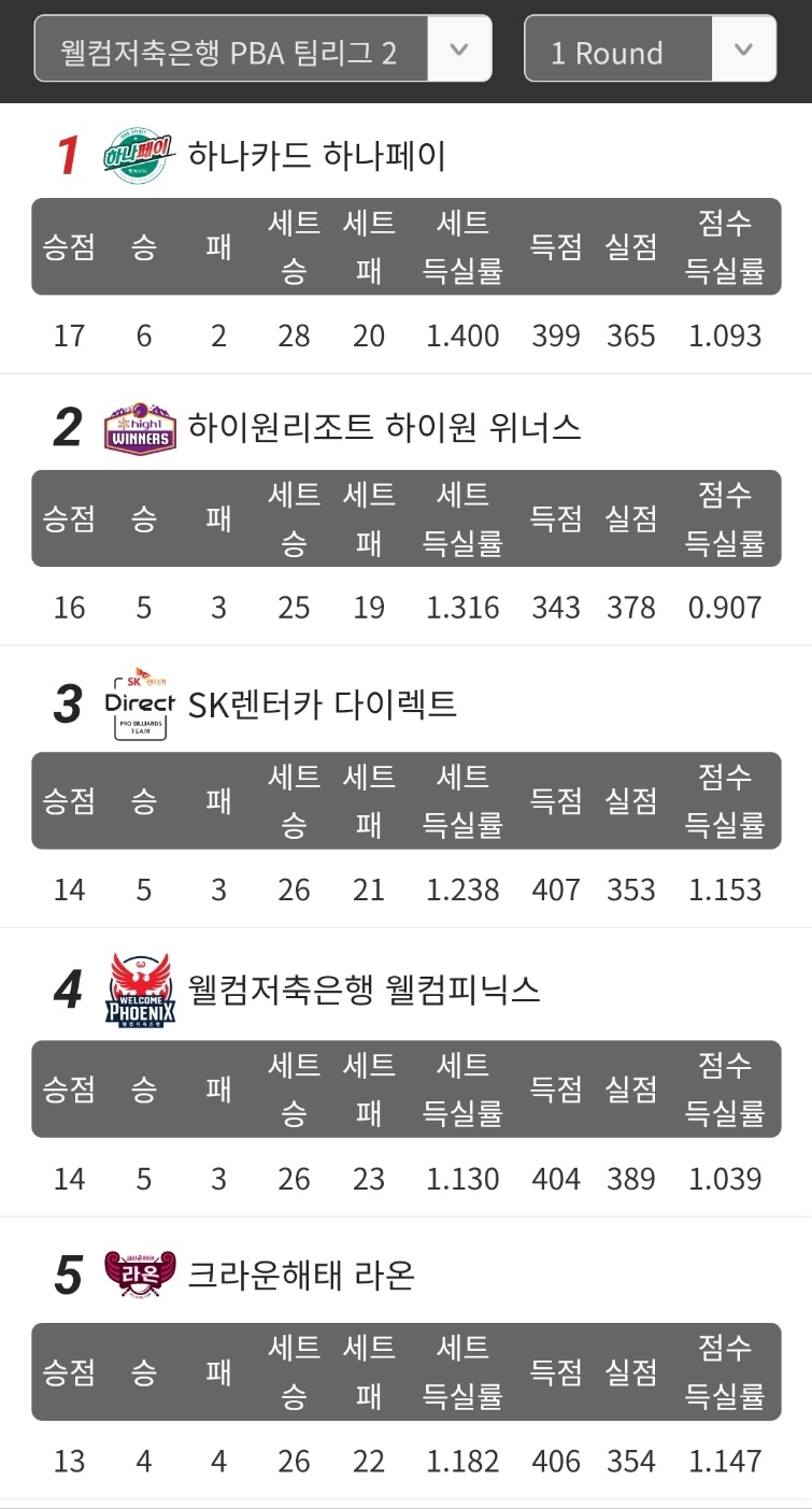 다니엘 산체스가 주장인 웰컴저축은행 당구팀은 최성원이 주장으로 있는 휴온스 당구팀을 4대2로 꺾으면서 휴온스를 1라운드 꼴찌로 확정지었습니다. 휴온스 당구팀 선수명단이 괜찮은데 1라운드에서는 좀처럼 성적을 못 내고 있습니다.