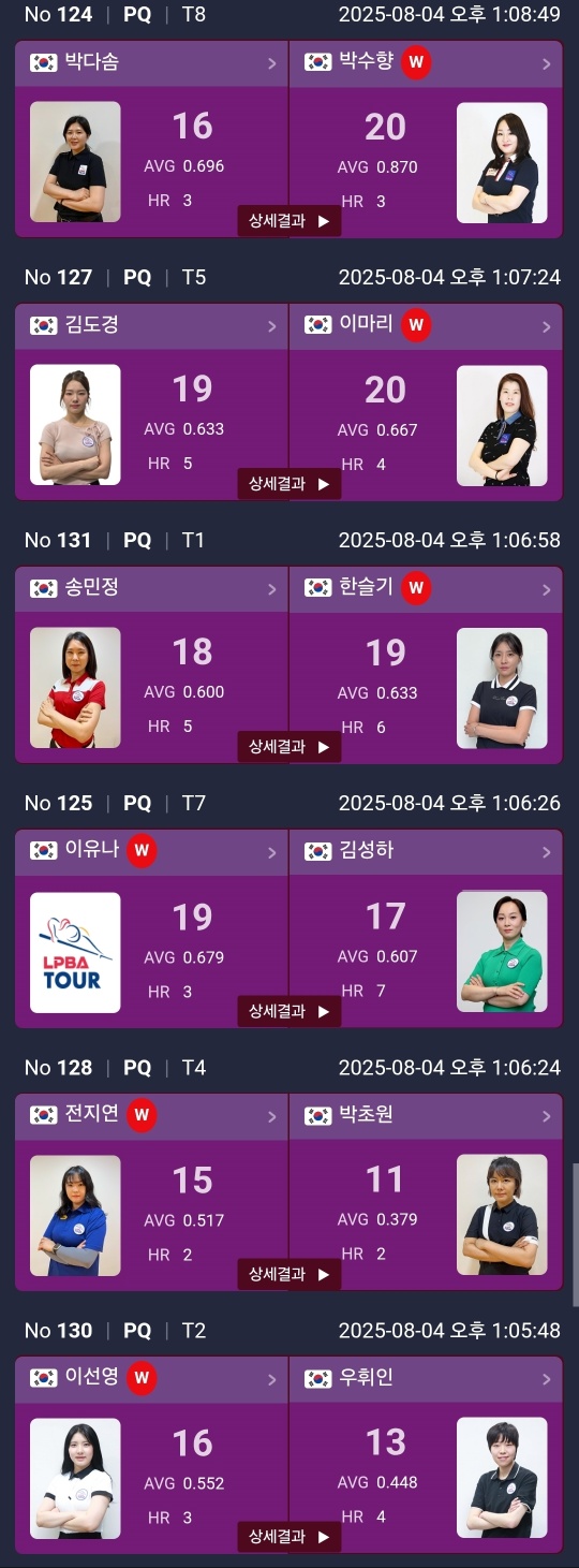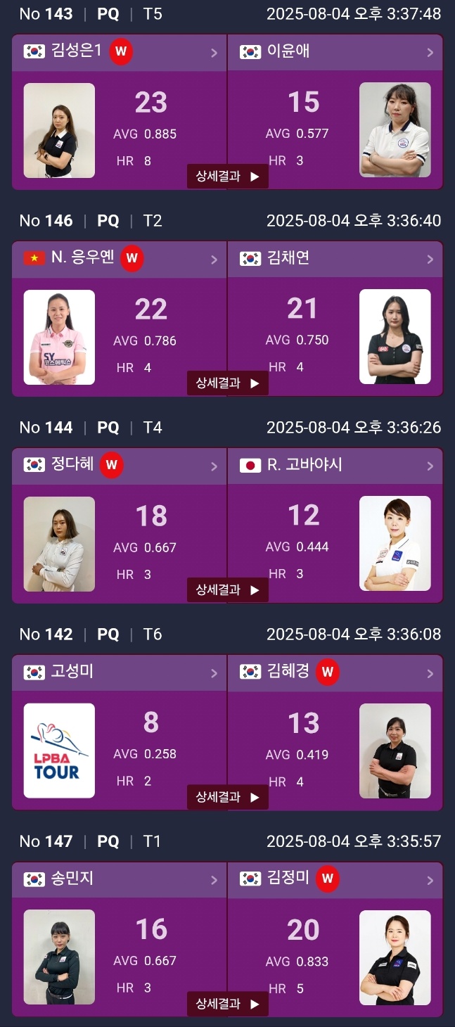 | NH농협카드 LPBA 챔피언십 PQ 라운드 대진표 - PPQ 경기결과 (25-26) (2) | 2025.08.03 |