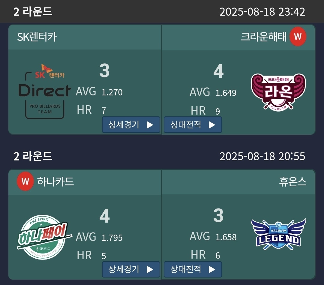 | 프로당구 PBA 팀리그 2라운드 3일차 경기결과 순위 - 1위 휴온스 당구팀(25-26) (0) | 2025.08.20 |