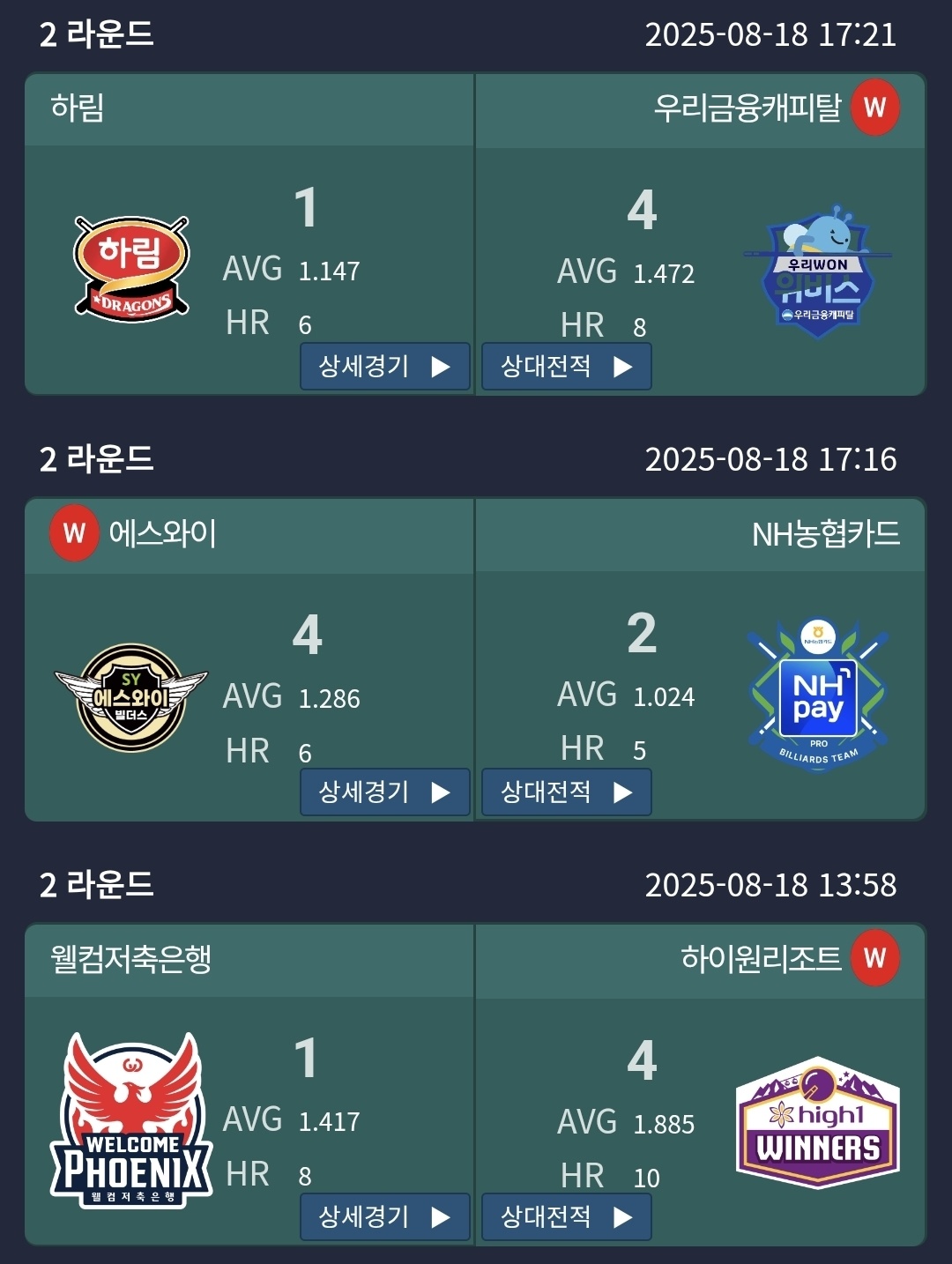 | PBA 팀리그 2라운드 1일차 경기결과 순위(25 - 26) - 1위 하나카드, 2위 웰컴 피닉스 (4) | 2025.08.18 |