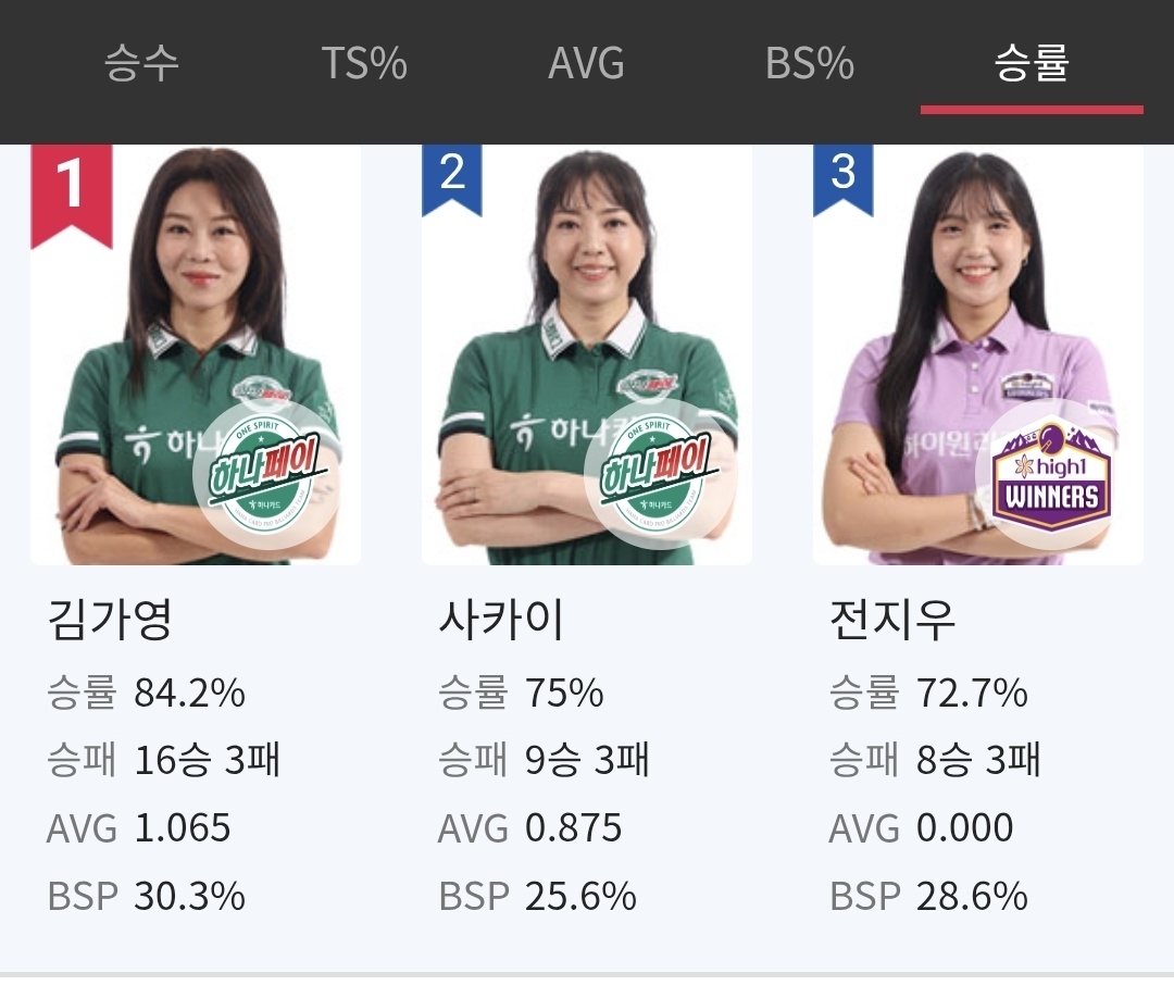 한편 1라운드 2일차까지 정규리그 현재 승률 1위를 기록하고 있는 당구선수는 김가영입니다. 김가영은 승률 84.2%를 기록하고 있습니다. 2위는 사카이 아야코, 3위는 전지우 당구선수입니다.