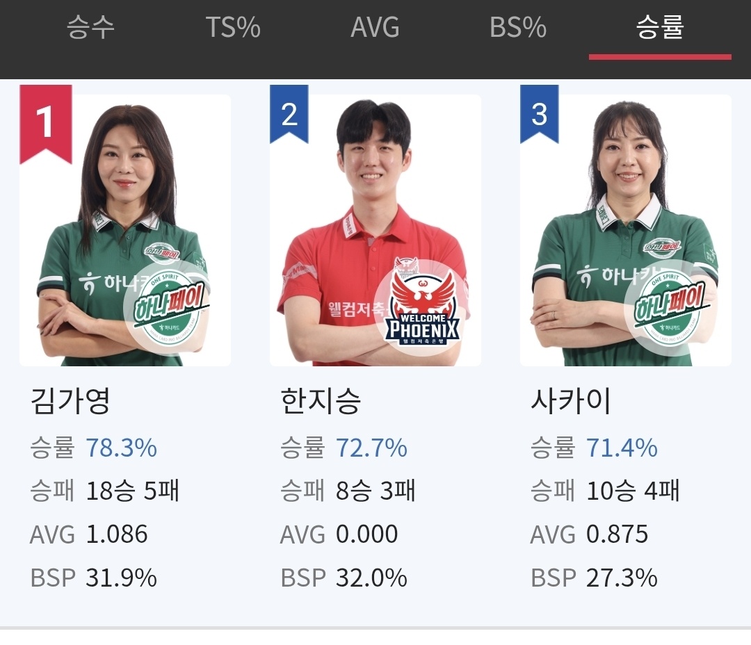 한편 2라운드 4일차까지 정규리그 현재 승률 1위를 기록하고 있는 당구선수도 김가영입니다. 김가영은 승률 78.3%를 기록하고 있습니다. 2위는 정수빈 선수의 연인으로 알려진 한지승, 3위는 사카이 아야코 선수가 올라 있습니다.