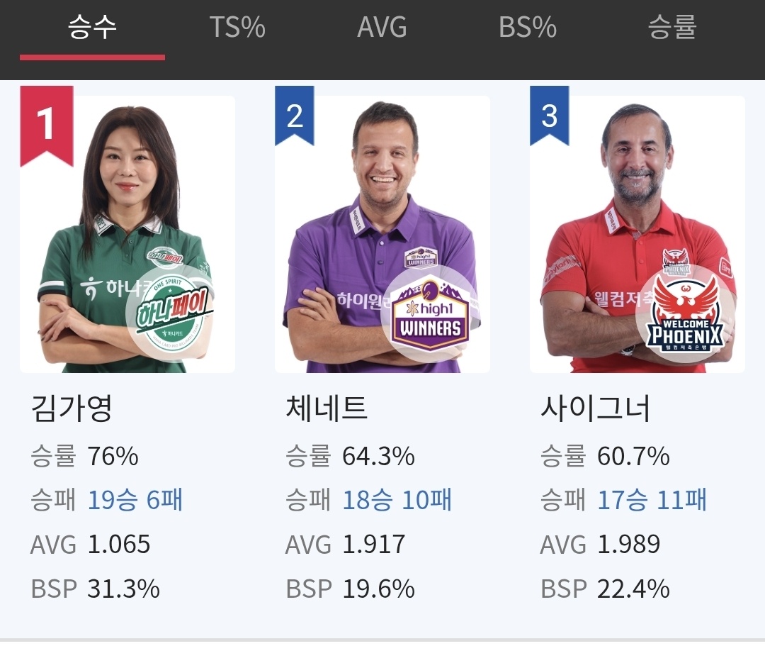 한편 2라운드 5일차까지 정규리그 뱅크샷 득점비율(BSP) 1위를 기록하고 있는 당구선는 김보미입니다. 김보미는 44.4%를 기록하고 있습니다. 2위는 백민주, 3위는 한지승 연인으로 알려진 정수빈 선수가 올라 있습니다.