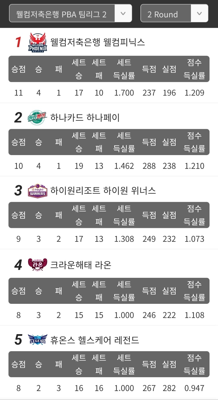 1위 웰컴저축은행 당구팀입니다. 웰컴은 2라운드 처음으로 4승 1패 승점 11점으로 1위를 달리고 있습니다. 2위는 하나카드 당구팀 으로 하나카드는 잠시 4승 1패 승점 10점으로 2위로 한단계 내려갔습니다.