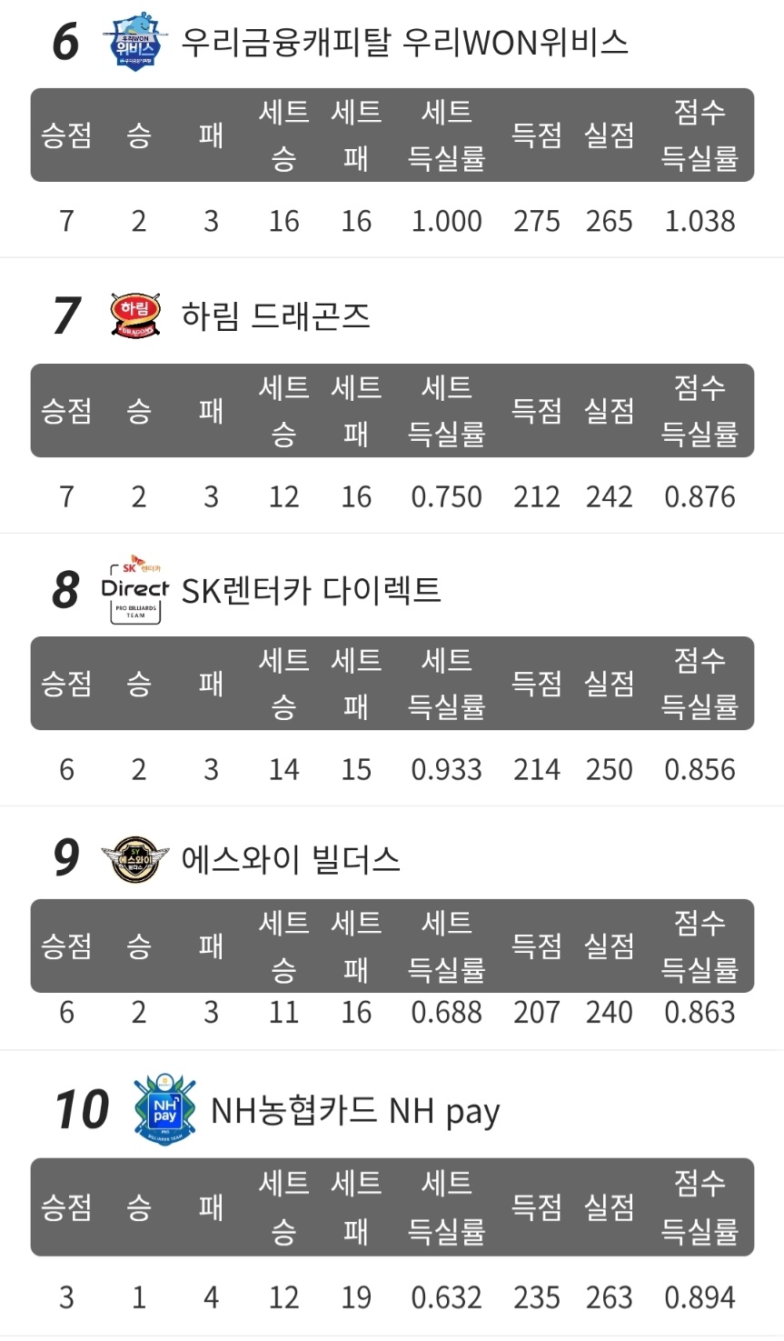 한편 4, 5위는 승점 8점으로 동일하지만 세트득실을 따져 순위가 결정되었습니다. 앞으로 경기가 진행되면서 차이가 벌어질 수 있습니다. 또 잠시 1위에 올랐던 휴온스 당구팀은 5위로 내려앉았습니다.