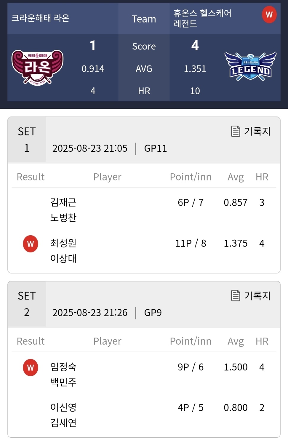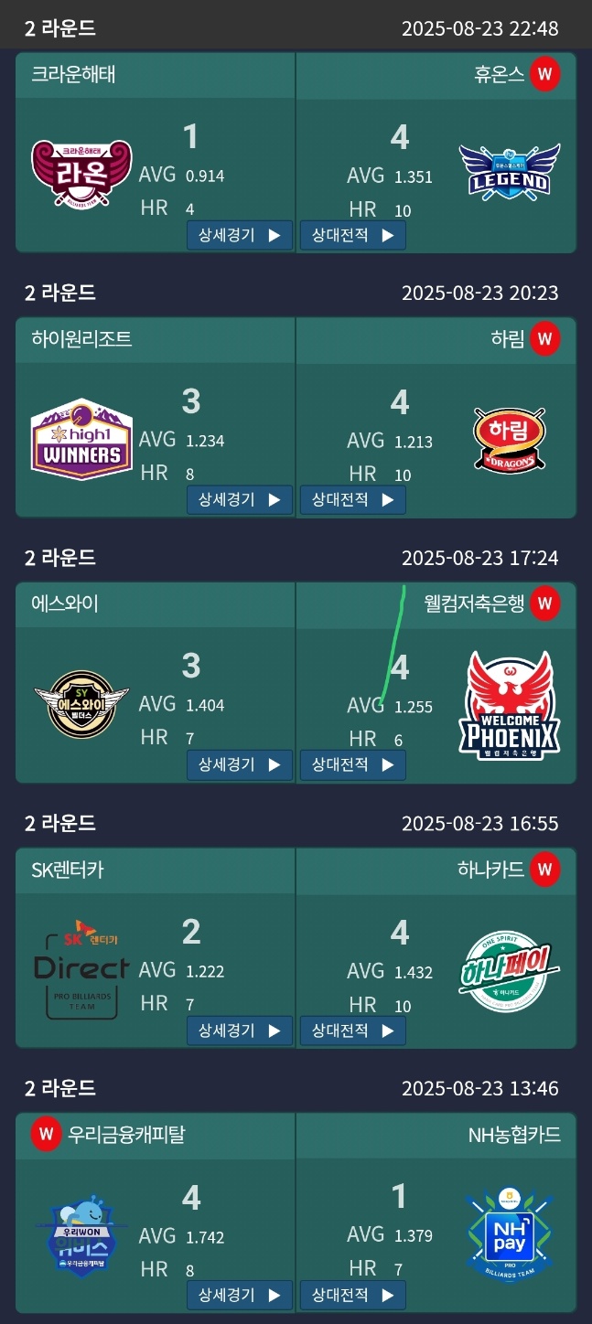 | 프로당구 PBA 팀리그 2라운드 3일차 경기결과 순위 - 1위 휴온스 당구팀(25-26) (0) | 2025.08.20 |