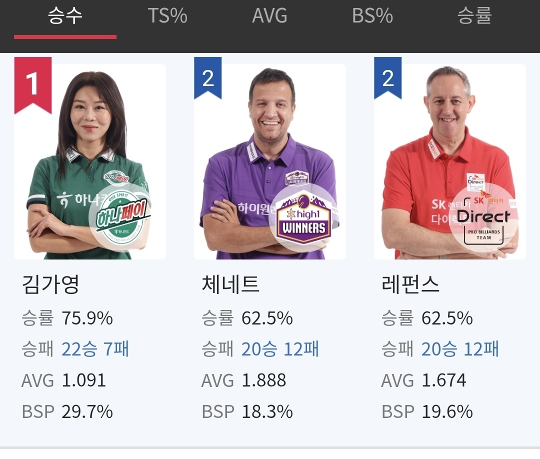 현재까지 정규리그 전체 승수 1위를 기록하고 있는 선수는 김가영입니다. 김가영은 22승 7패로 압도적인 1위를 기록하고 있습니다. 2위는 튀르키예당구선수 륏피 체네트(루피 체넷)으로 20승 12패, 3위는 세미 사이그너 를 밀어내고 벨기에 당구선수 레펀스가 20승 12패를 기록하고 있습니다.