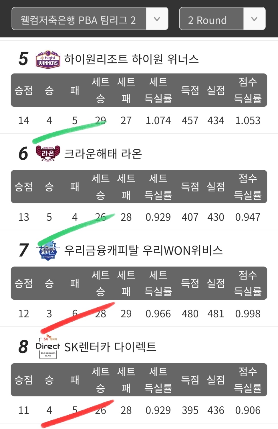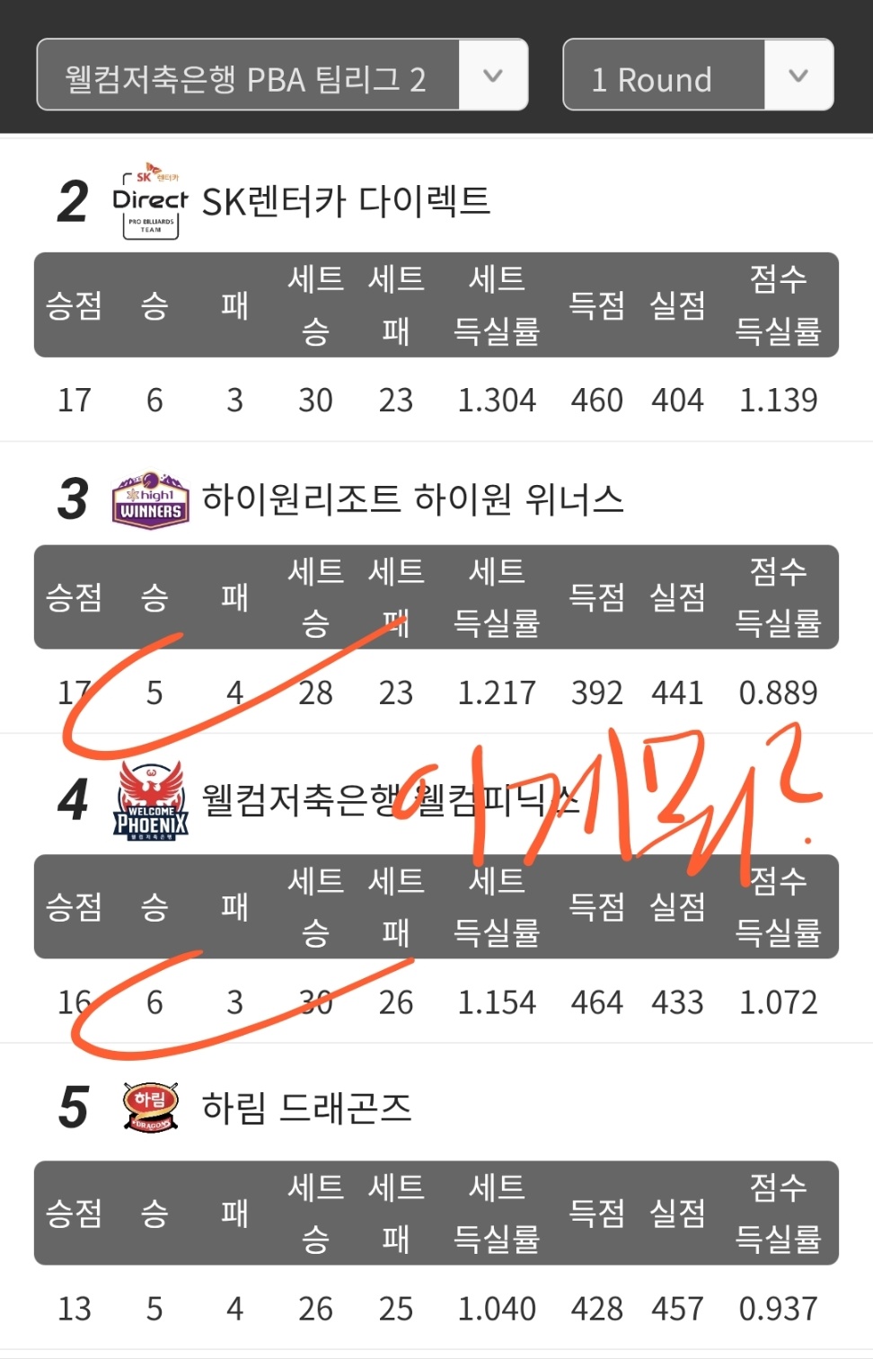 위에서 장황하게 설명했습니다만 PBA 팀리그 1라운드, 2라운드 승패 현황 실제 사례를 보면 바로 이해가 될 것입니다.