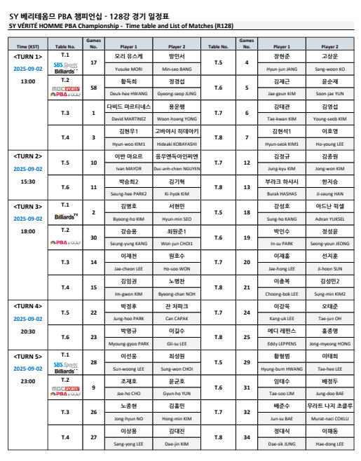 프로당구 2025-26시즌 2차투어, SY 베리테옴므 PBA 챔피언십 128강 경기 일정은 9월 2일과 3일에 걸쳐 펼쳐집니다. 프로당구 중계 방송 및 경기 시간 등 자세한 내용은 위의 자료를 참고하시기 바랍니다.