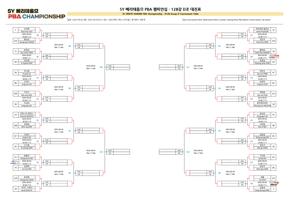 SY 베리테옴므 PBA 챔피언십 128강 D조 대진표