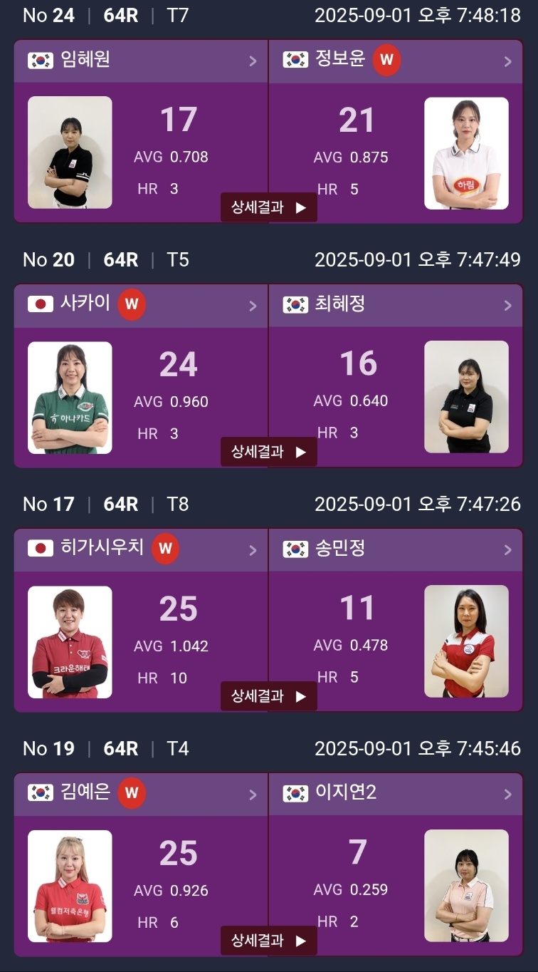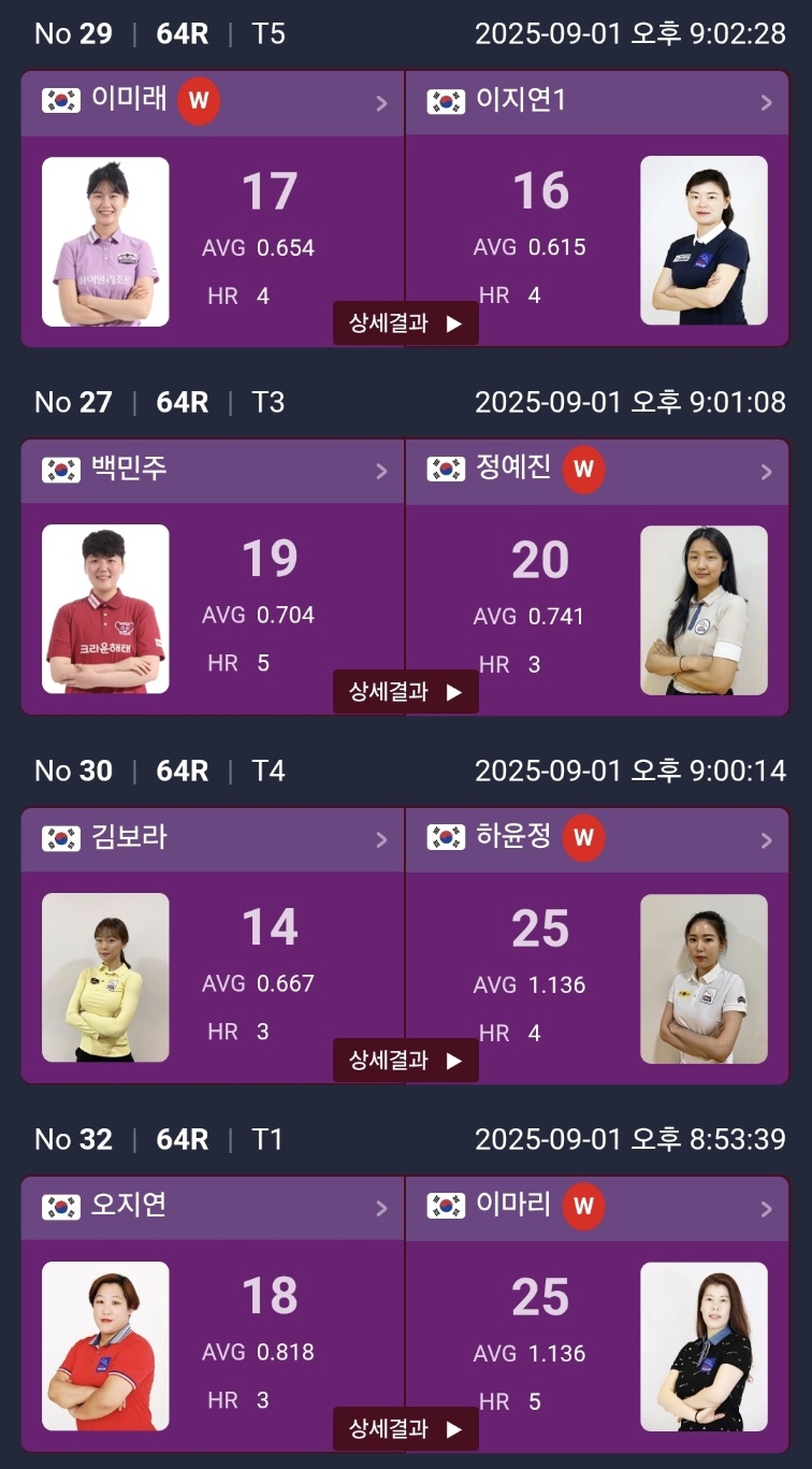 | SY 베리테옴므 LPBA 챔피언십 16강 대진표 - 32강 1일차 경기결과 (3) | 2025.09.02 |