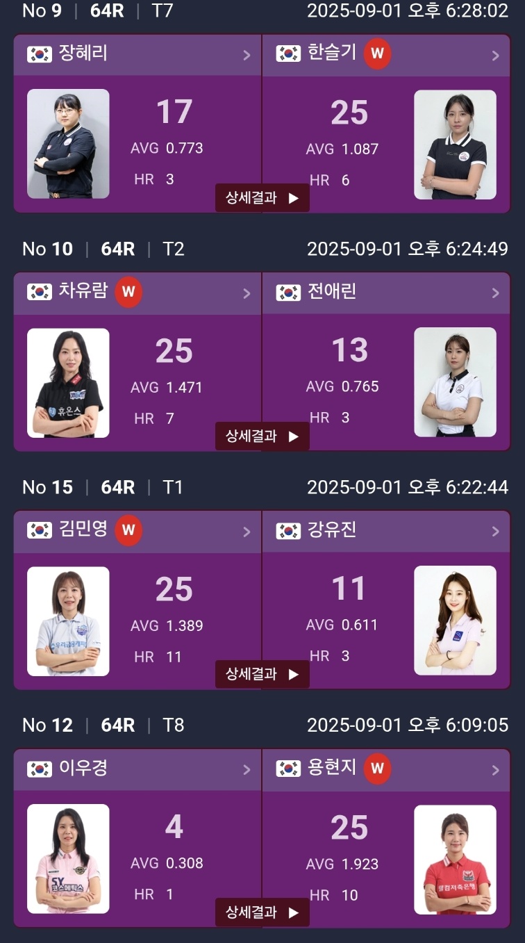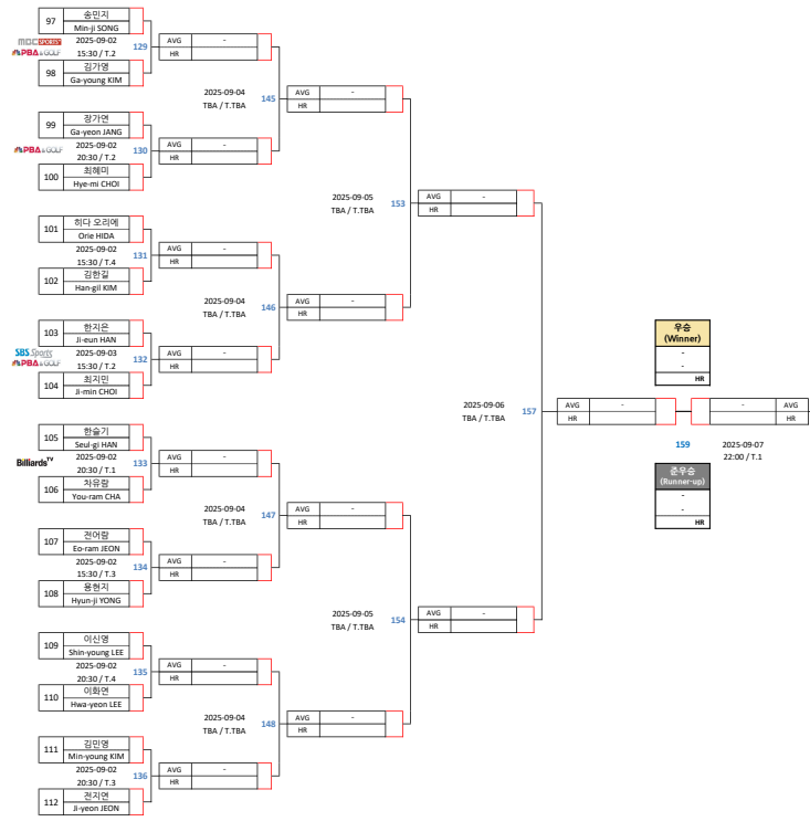 | SY 베리테옴므 PBA 챔피언십 64강 대진표 - 128강 1일차 경기결과 (1) | 2025.09.03 |