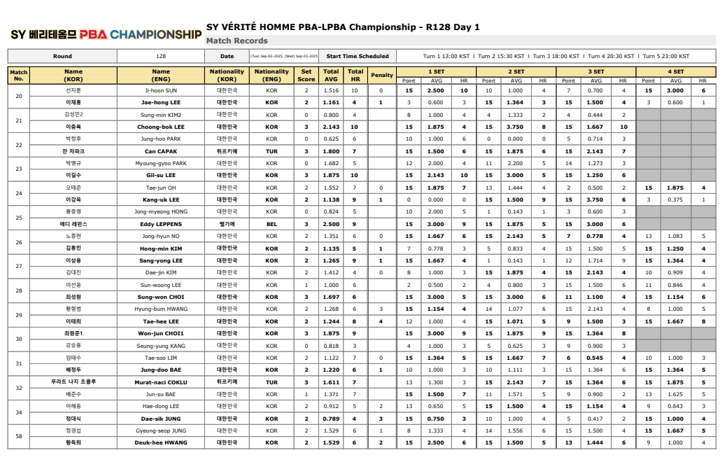 1. SY 베리테옴므 PBA 챔피언십 128강 1일차 경기결과