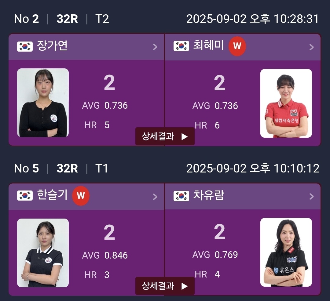 9월 2일 SY 베리테옴므 LPBA 챔피언십 32강 1일차 경기 결과입니다. 김가영, 최혜미, 히다 오리에, 한슬기, 전어람, 이신영, 김민영, 스롱 피아비가 32강 1일차 경기에서 승리를 거두고 16강 대진표에 먼저 이름을 올렸습니다.