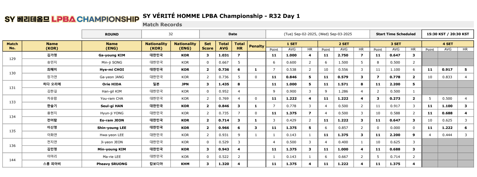 한편 SY 베리테옴므 LPBA 챔피언십 32강은 1차 예선전에 해당하는 PPQ라운드, 2차 예선전에 해당하는 PQ라운드 및 64강 경기를 거쳐 32강에 진출한 선수들 간의 경기로 9월 2일과 3일 양일에 걸쳐 경기가 진행되었습니다.