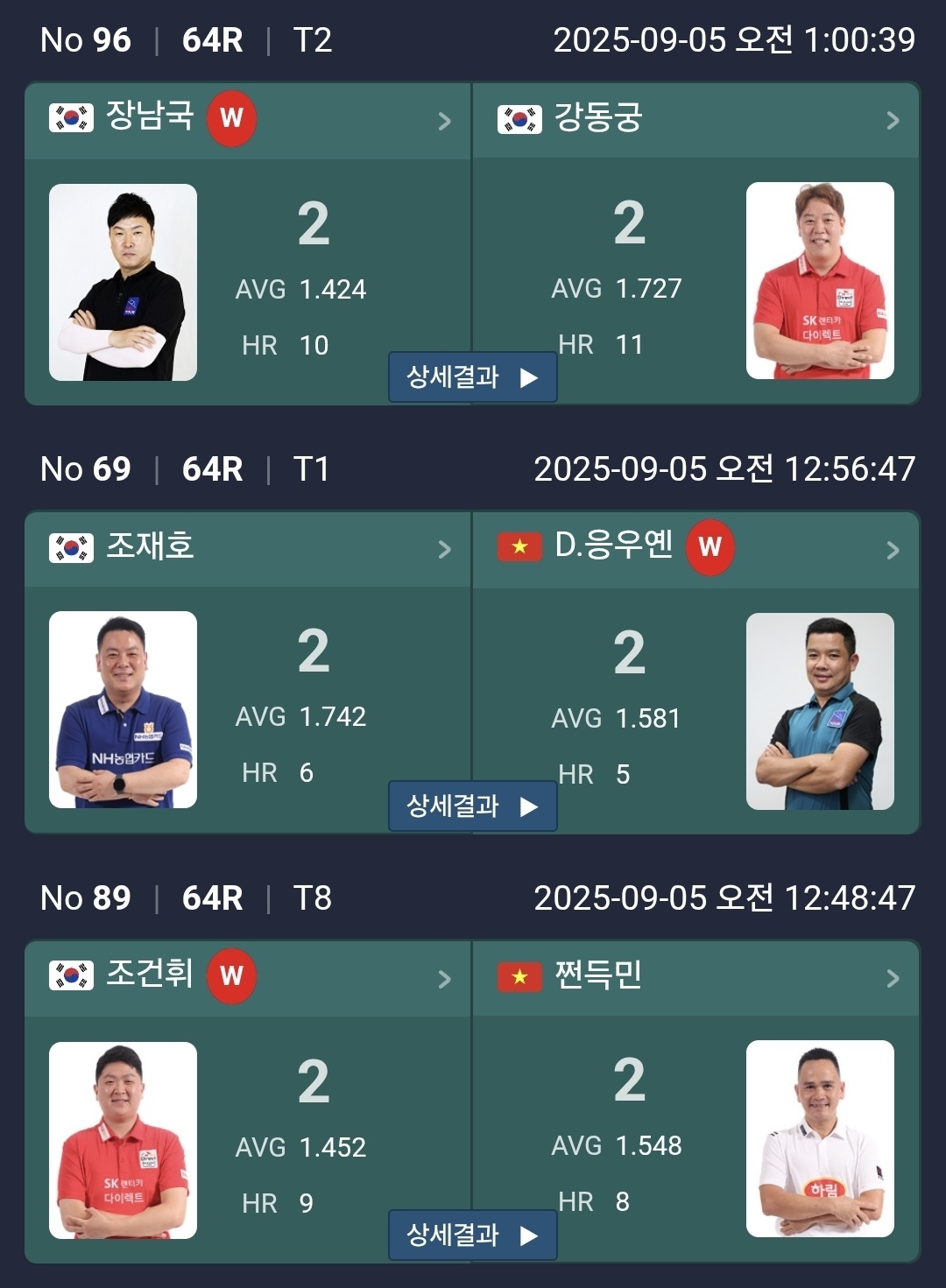 한편 베트남 선수 가운데는 PBA팀리그 당구팀 소속에서 이번 시즌에 방출된 응우옌 득아인찌엔 (둑안치엔) 외에 응오딘나이, 응우옌 프엉린, 응우옌꾸옥 모두 32강에 진출했습니다.