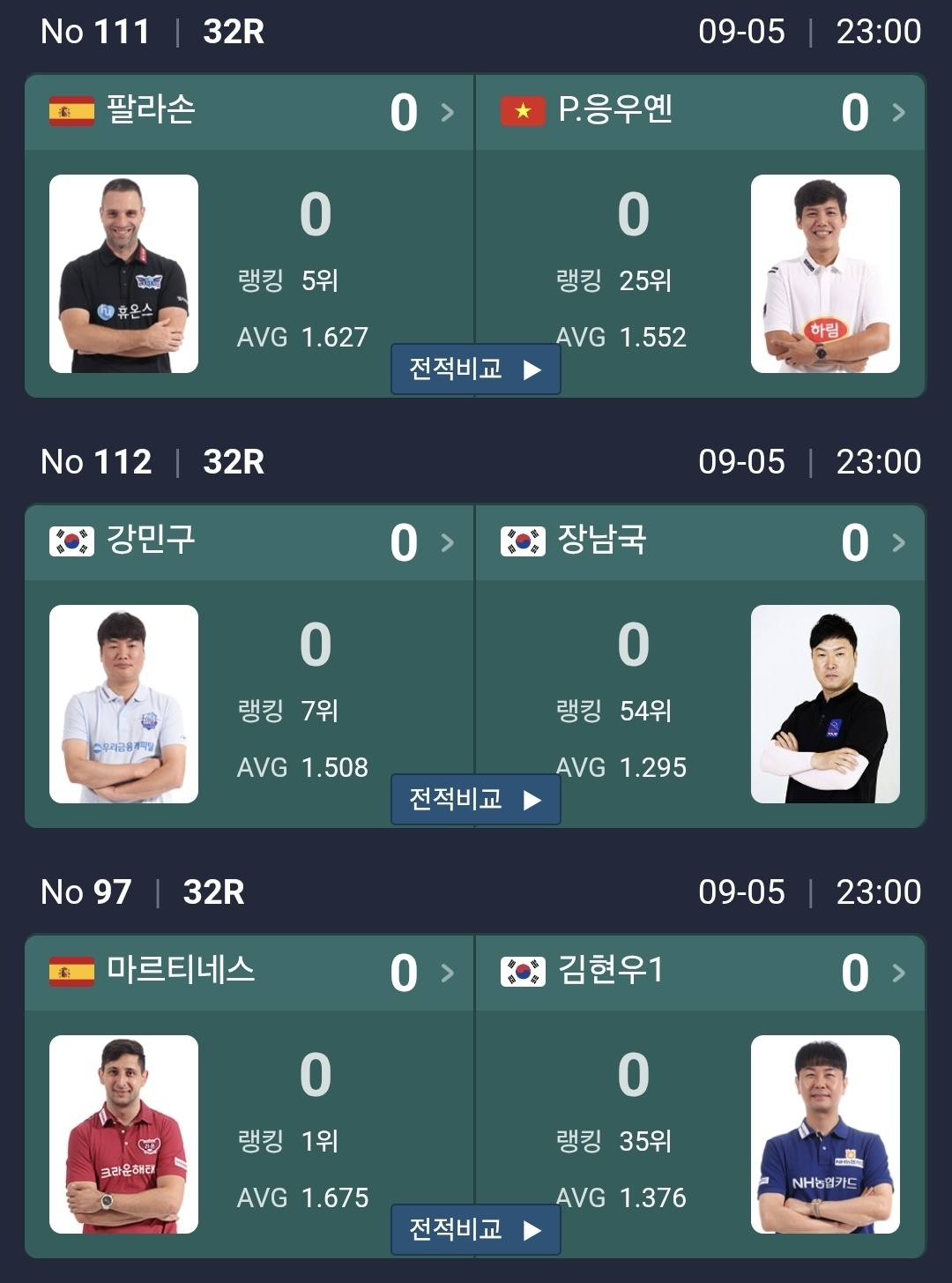 그 외 원호수, 이재홍, 김홍민, 정대식, 장남국 등 PBA 프로당구에서 도약을 꿈꾸는 PBA 랭킹 하위권 선수들이 대거 32강에 진출하였습니다.
