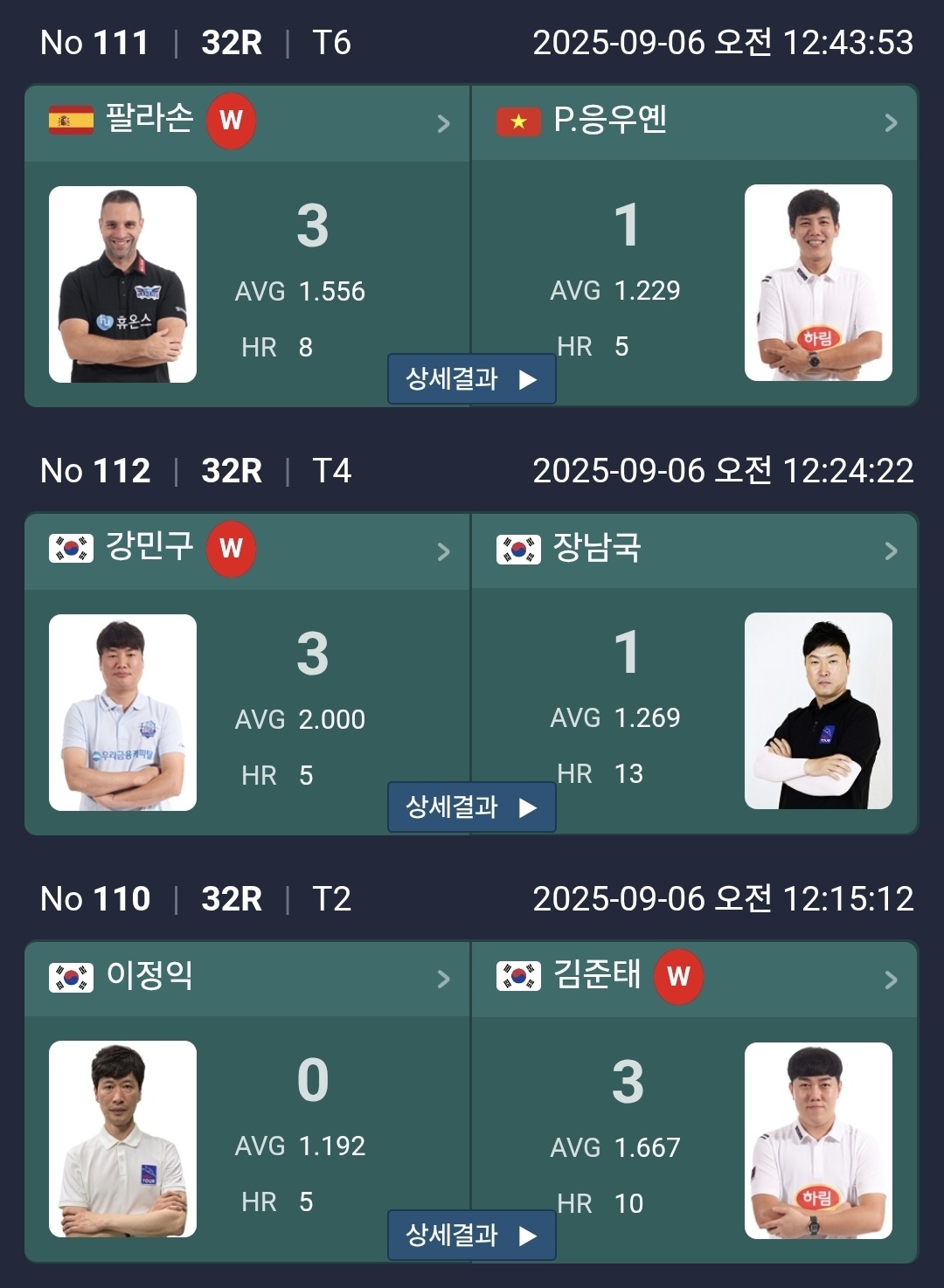 SY 베리테옴므 PBA 챔피언십 32강 주요 경기결과 입니다. 랭킹 1위 다비드 마르티네스를 김현우가 신들린 플레이로 3대 0으로 꺾었습니다. 김현우 당구선수가 아직 상위권 성적을 내지 못했는데 이번이 기회인 것 같습니다.